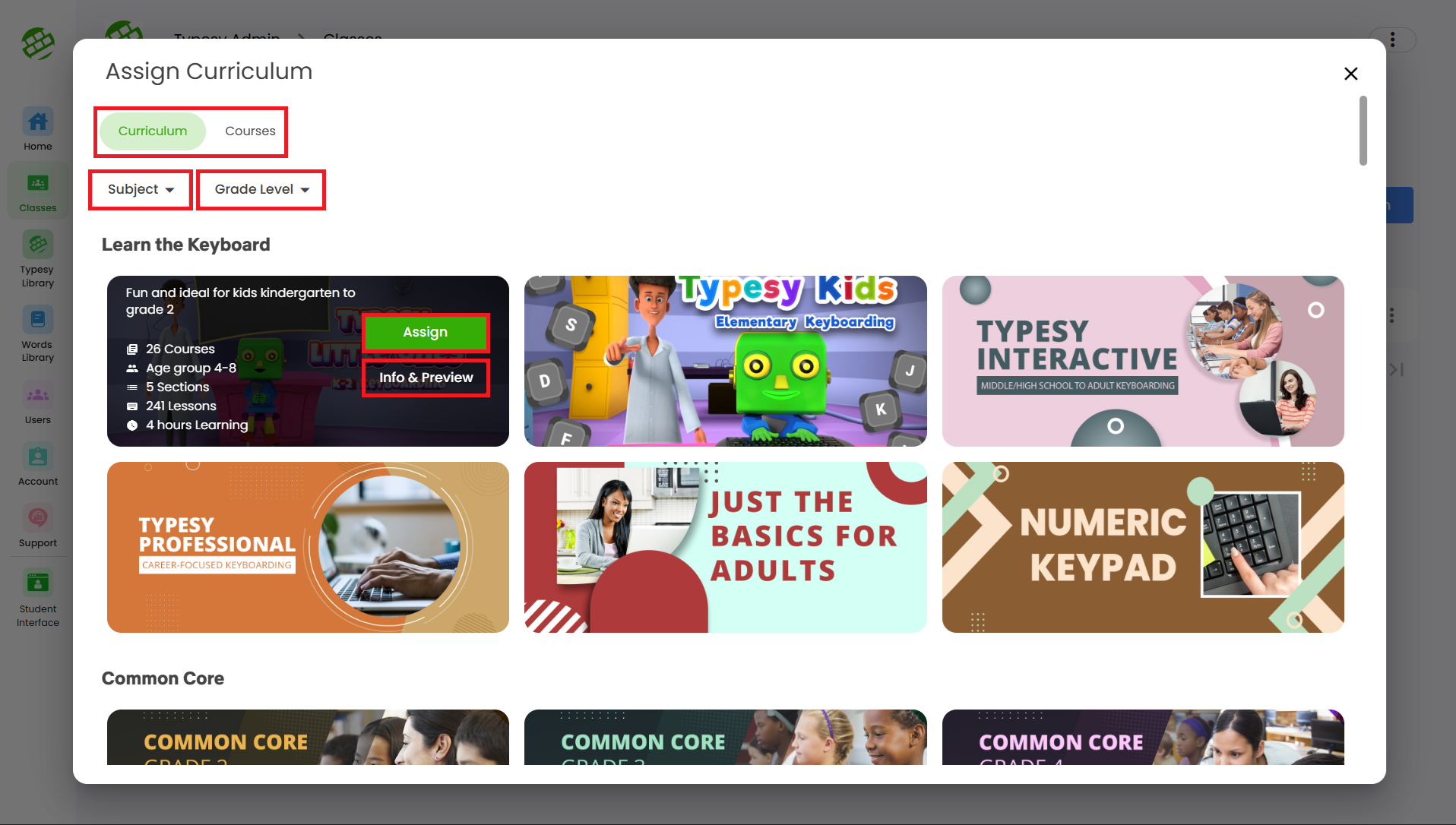 1. You can assign or unassign curriculums for a single class or multiple classes by going to the Typesy Library. Hover your mouse over the curriculum(s) you want to provide, check the box, and then select Assign.