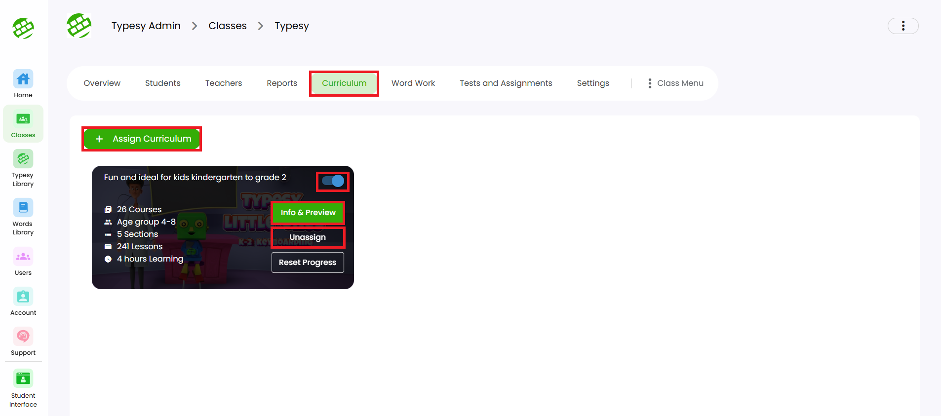 To remove an assigned curriculum, hover your mouse over it, and click on Unassign. You may also use the toggle switch to enable or disable an assigned curriculum.