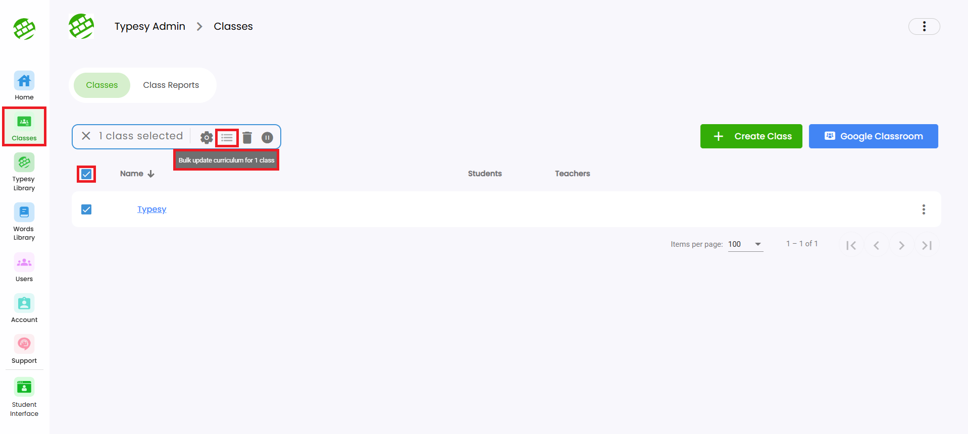 1. Another option that is available is located in Classes. Select the classes you want to update, then click on the Bulk update curriculum button: