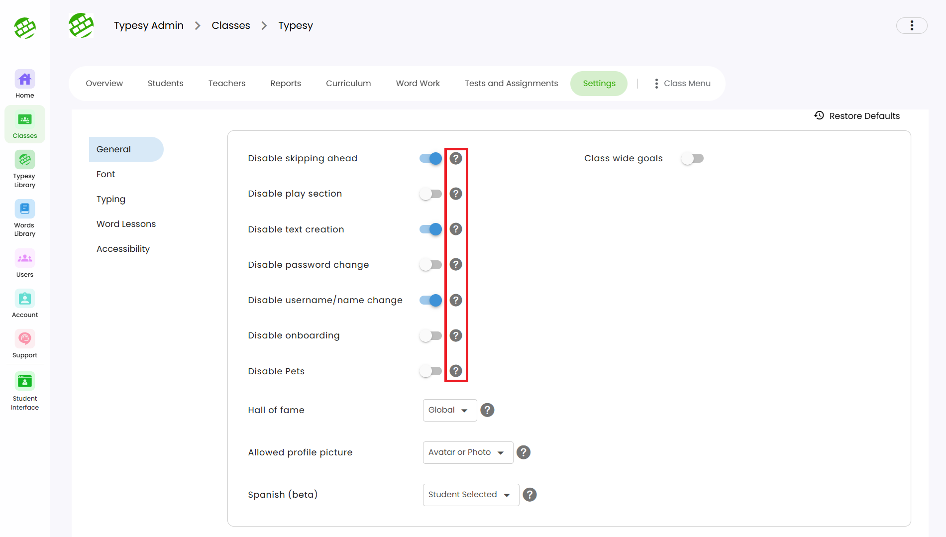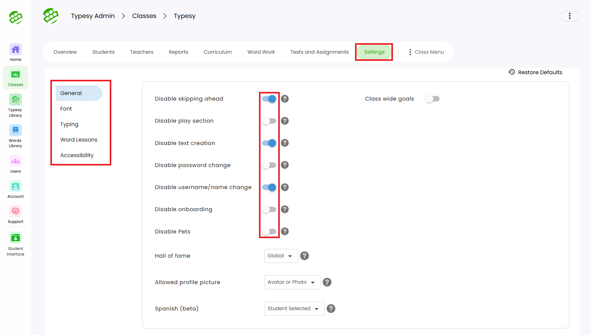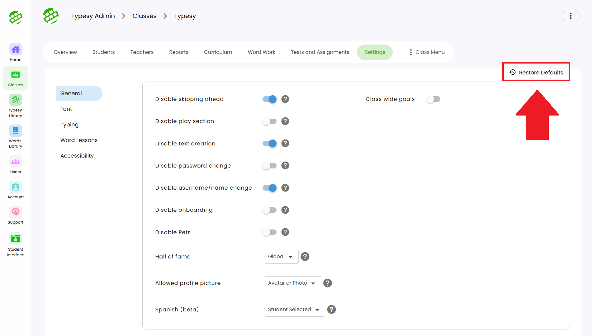 While admins and teachers have full control over which settings a student can change from the admin interface, any settings you've allowed will be accessible from the student's side. Here’s how students can access their settings: 1. During a typing ...