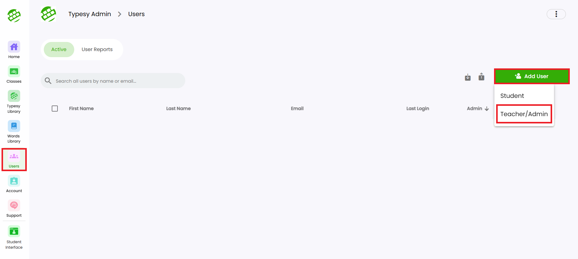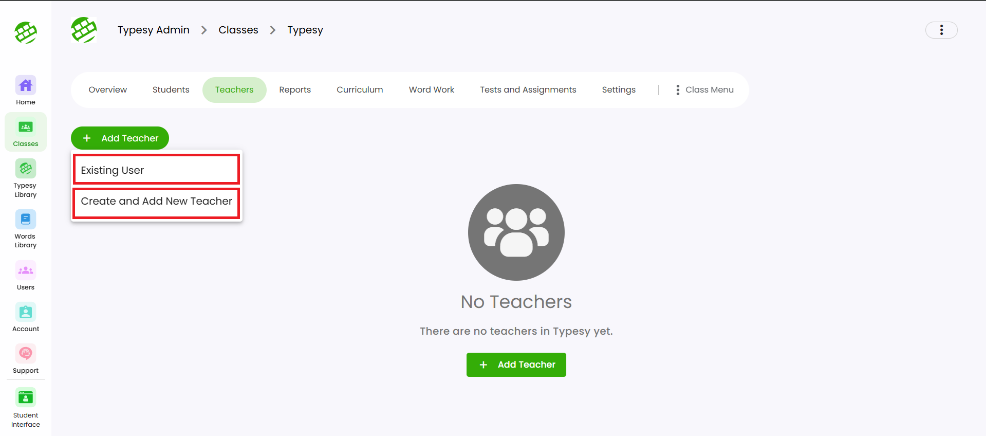 3. You can select an existing user account by choosing Existing User, or create a new teacher account by selecting Create and Add New Teacher.