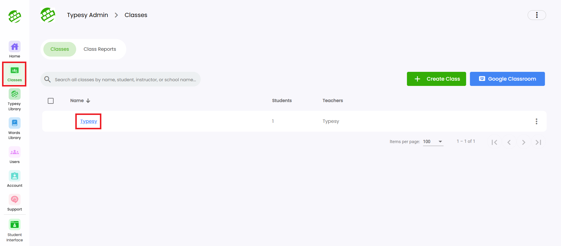 1. To check on student progress, go to Classes and select the class the student is enrolled in.