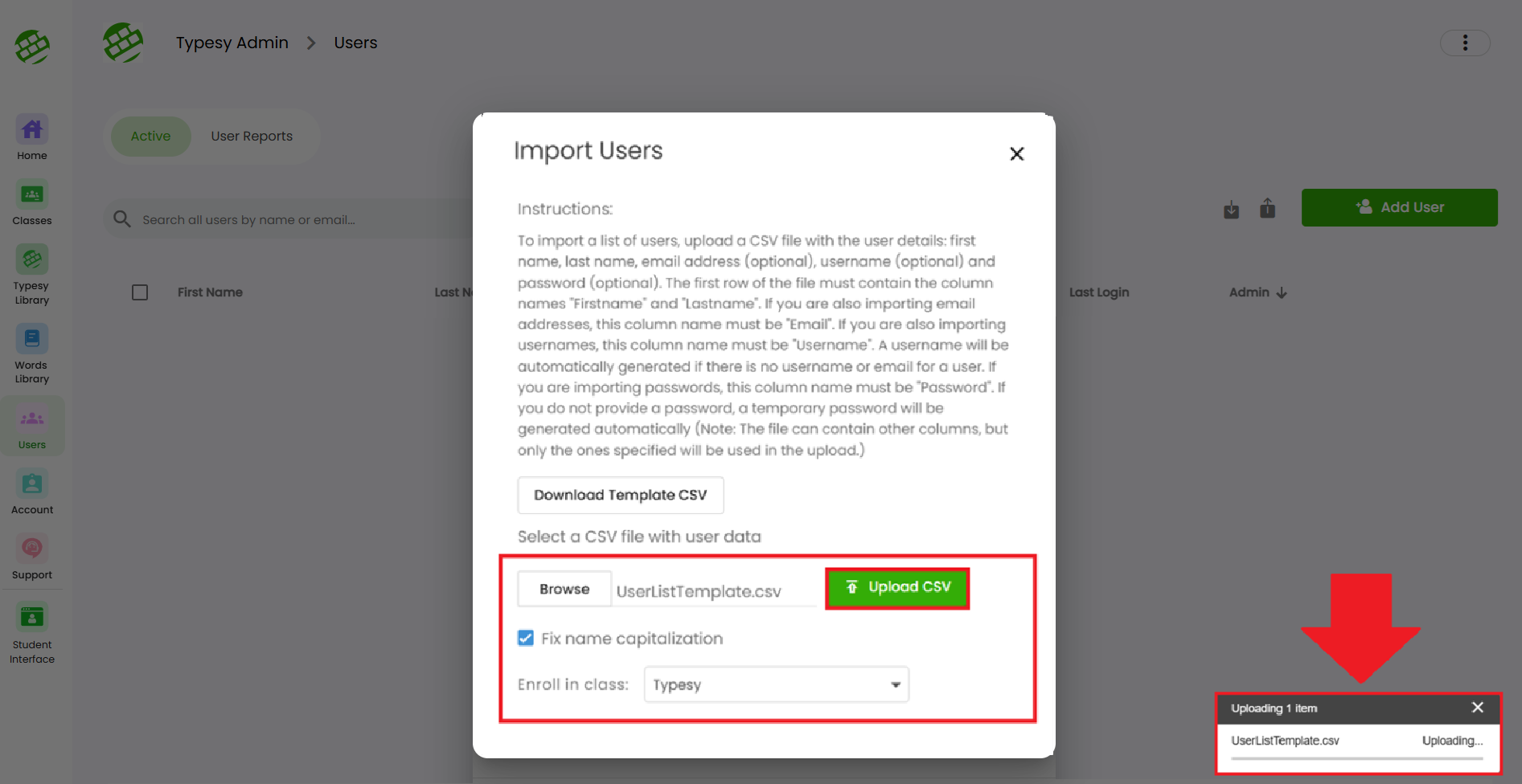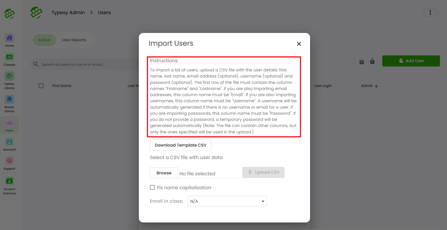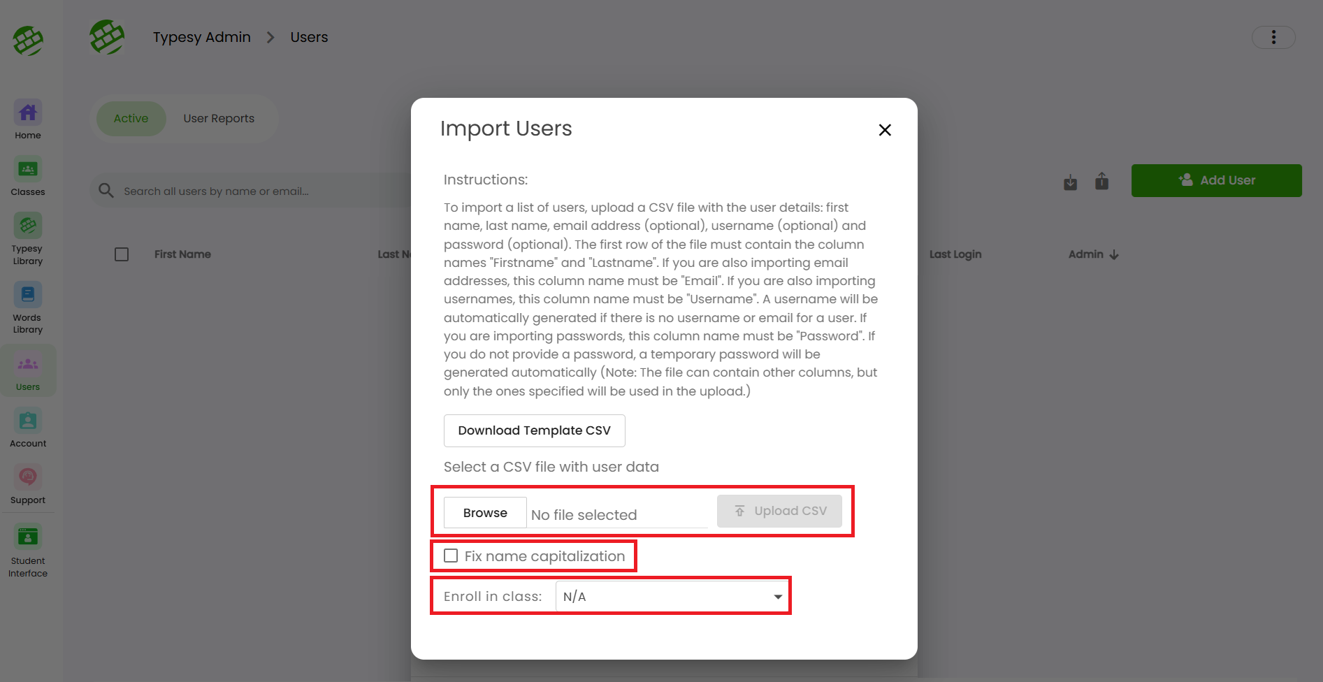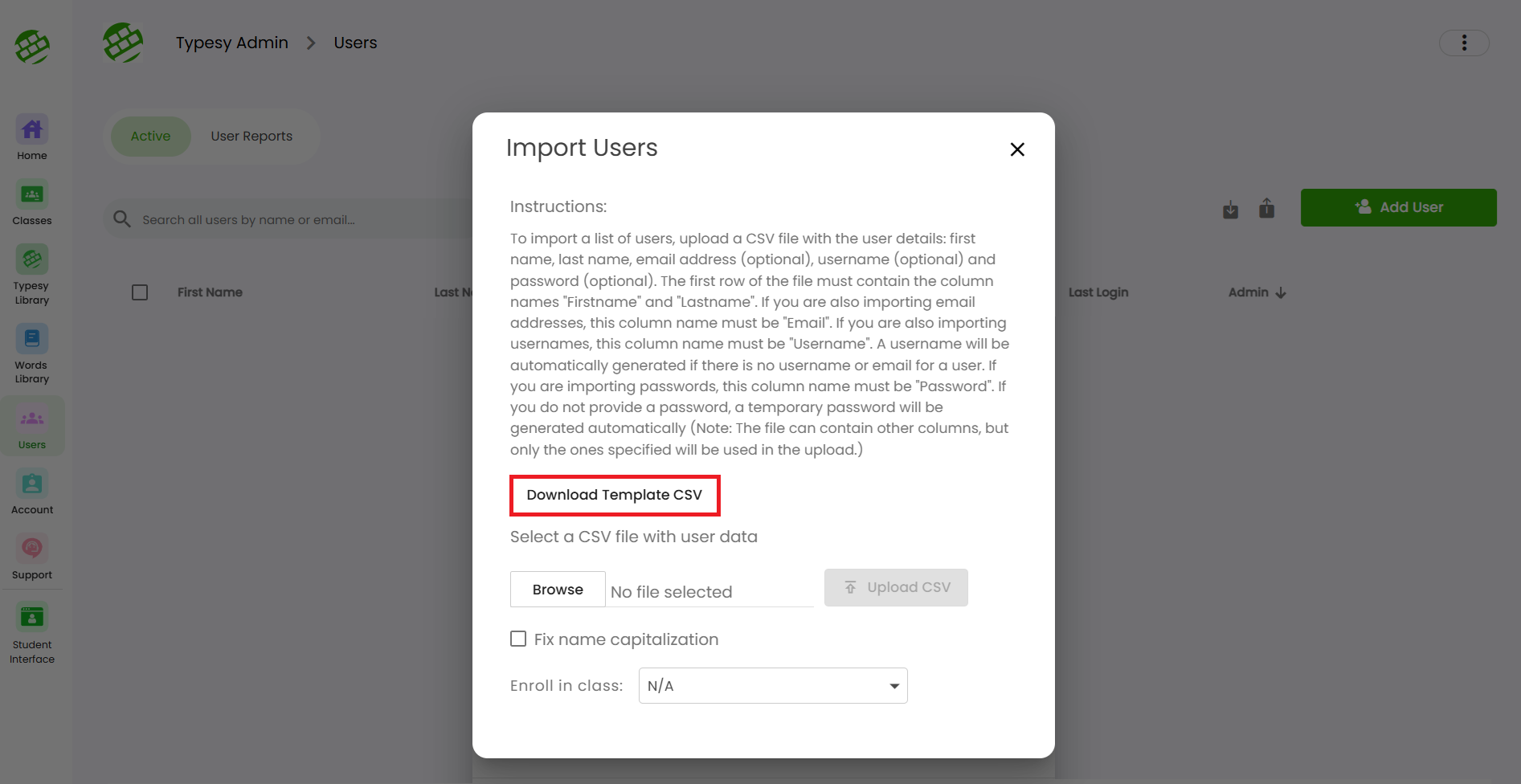 3. Click on Download Template CSV to get the spreadsheet you’ll use for importing users.
