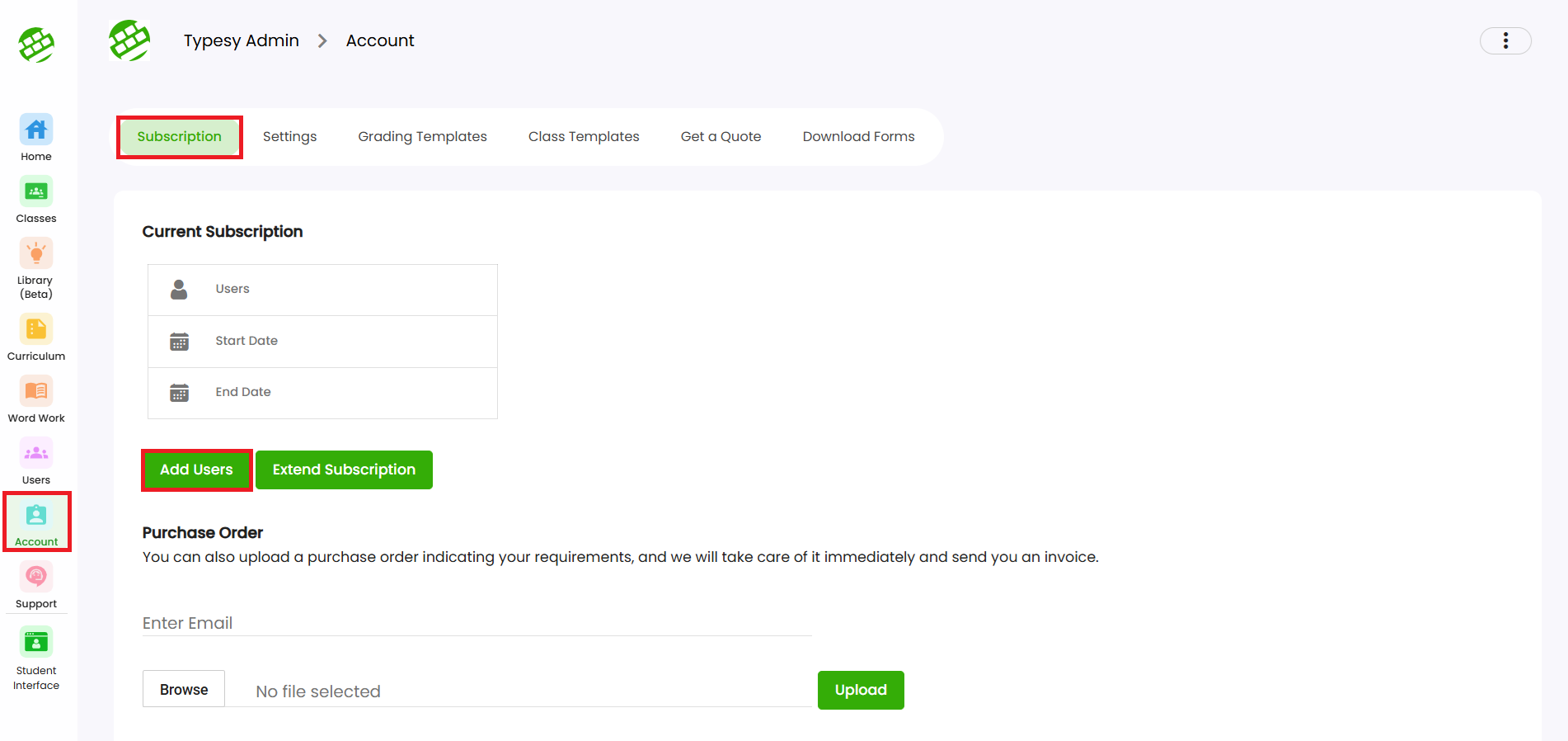 The Account section is where current administrators can manage subscriptions, download forms, and configure school-wide settings. 1. Subscription: View your current subscription details, including the subscription period and number of users. From ...