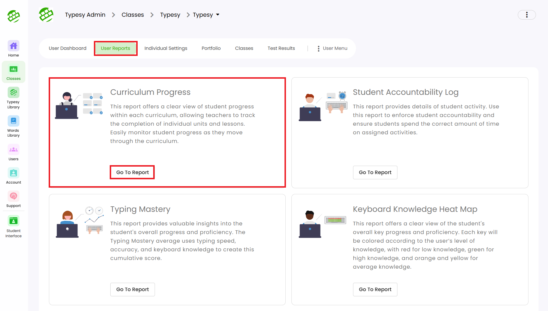 2. You'll be taken to their User Dashboard. From here, click on User Reports, then click on Go To Reports under Curriculum progress: