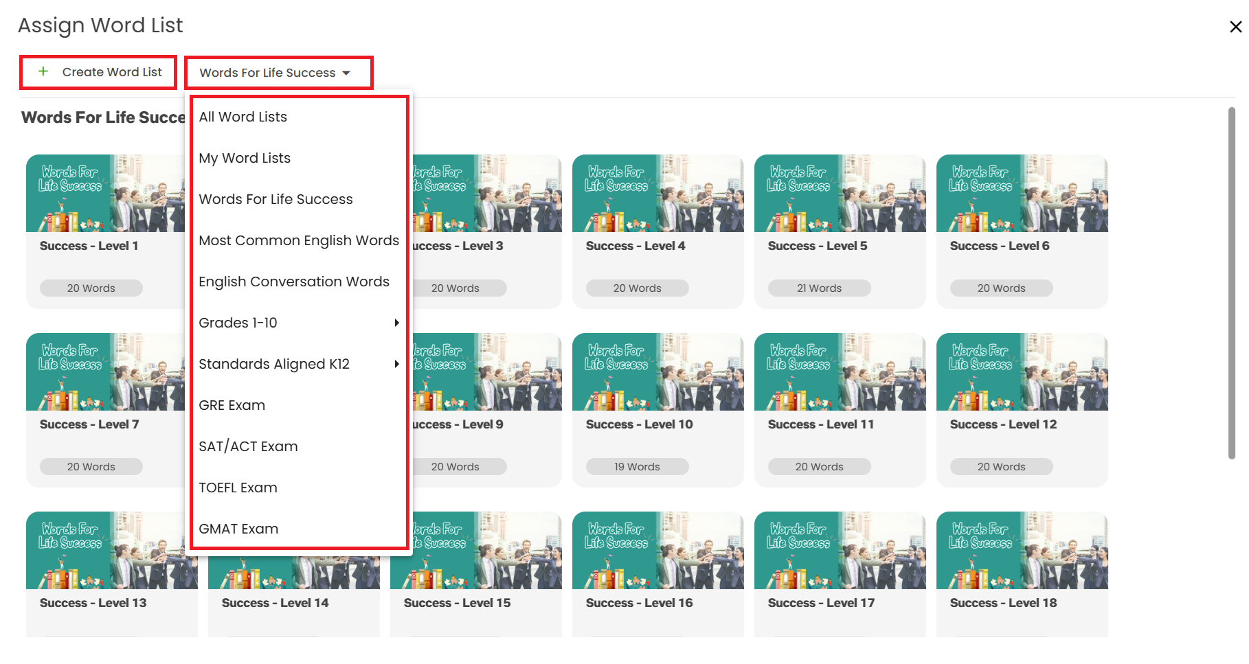 4. Hover your mouse over a word list, then click Assign, or click Preview to check its contents.