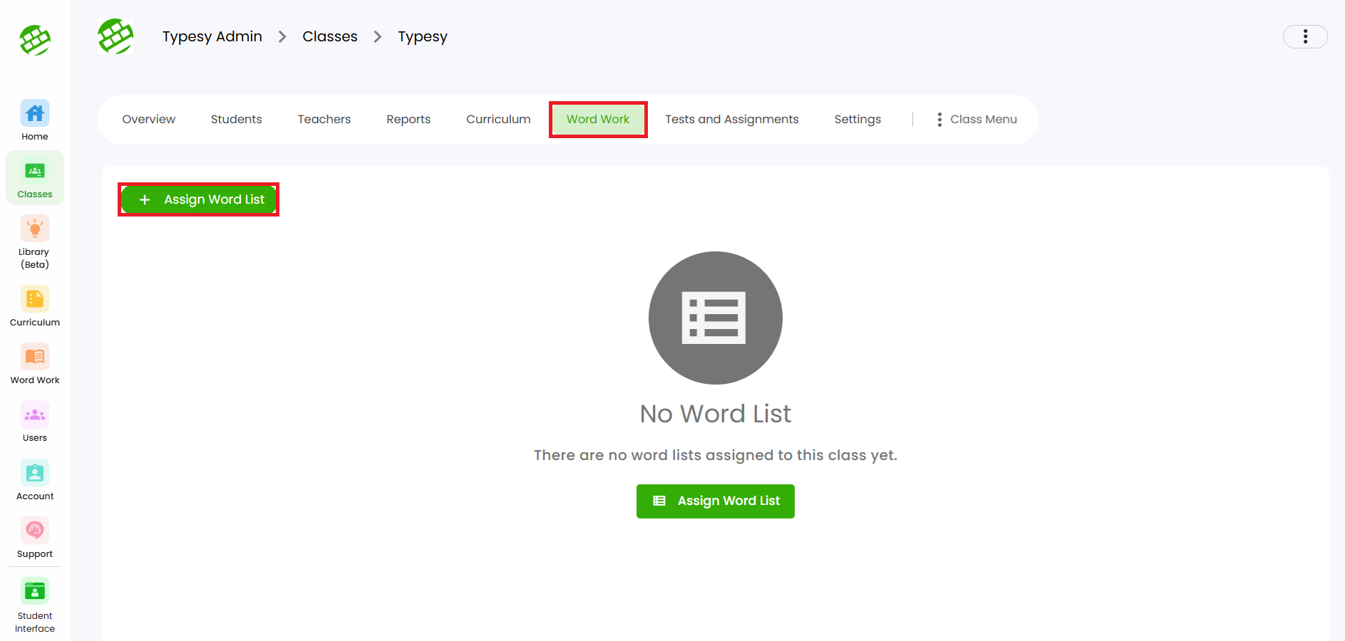 Typesy is more than just a typing program! The Word Work feature lets you assign custom or pre-made word lists to help your students learn and master new vocabulary. 1. Go to Word Work, then click Assign Word List. 2. Click Create Word List to make ...